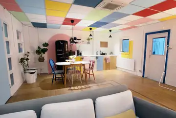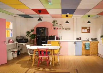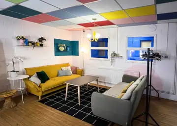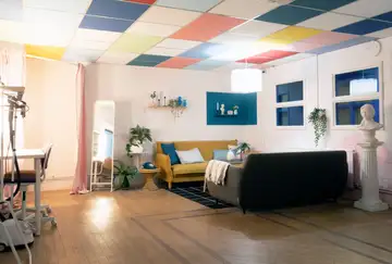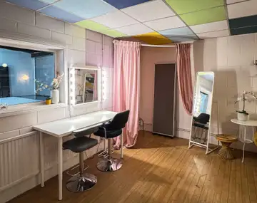 Alongside your hire is our colourful greenroom, equipped with kitchenette and dining area, sofas, makeup table and mirror, changing area, steamer, iron & board, clothing rails with hangers, and speaker.